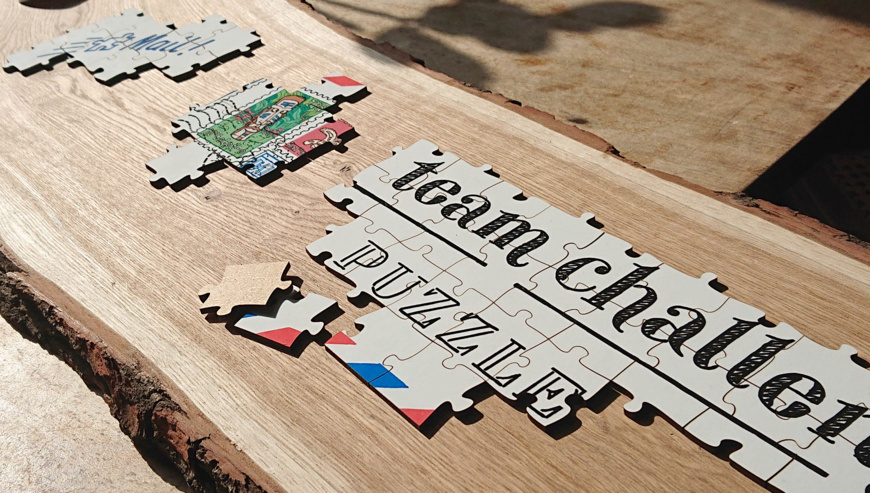 We specialize in large puzzle pieces with overprint. We also offer unprinted puzzle pieces that you can describe, glue and paint yourself on site. The format and shape of the individual pieces can be freely selected by the digitally controlled cutting process.